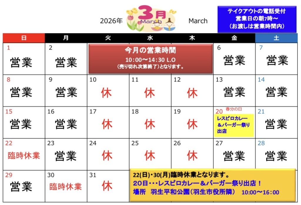 2026年3月の営業日及び営業時間について